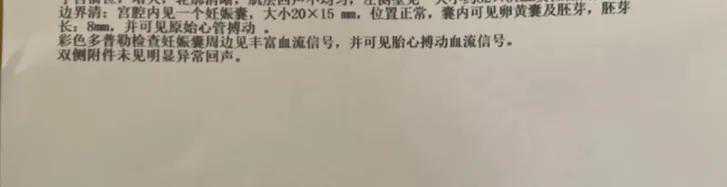 吃药打针到现在孕早期7周了,可以进入一超检查了,这次检查宝宝胎心胎芽发育情况,非常顺利我很开心,医生说发育得很好,妊娠囊20×15mm,胎芽长8mm了~。跟我同期开奖的另外一女孩她更紧张,因为她之前已经4次轮到一超才发现没有胎心胎芽空囊,那种情况她更伤心,这次她一超也照到胎心胎芽了,她老公和她当场开心飞起来,我也替她开心!只有女人能理解女人!