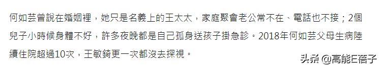 并且平时老公也对她的生活漠不关心,儿子身体不好,都是她孤身送儿子去医院,她的父母连续住院十次,王敏錡也是一次都没有去探望。