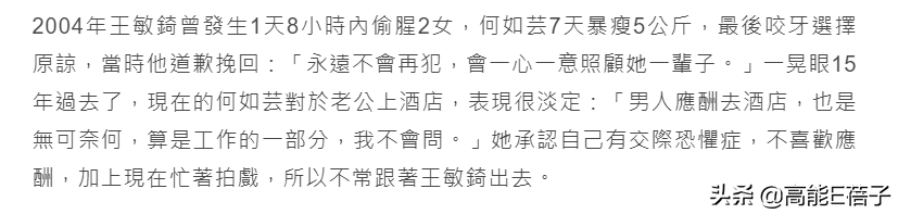 之后有媒体拍到王敏錡春风得意在外面玩,身边有三男三女,却不见何如芸,对此何如芸表现得很淡定,说:“男人应酬去酒店,也是无可奈何,算是工作的一部分,我不会问。”