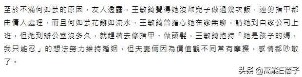 而王敏錡这边也没有保持沉默,怒斥何如芸“三宗罪”,包括她没帮儿子做过几次饭、花钱如流水、整天都在做指甲等,还拒绝亲密关系,让两人整天争吵不停。