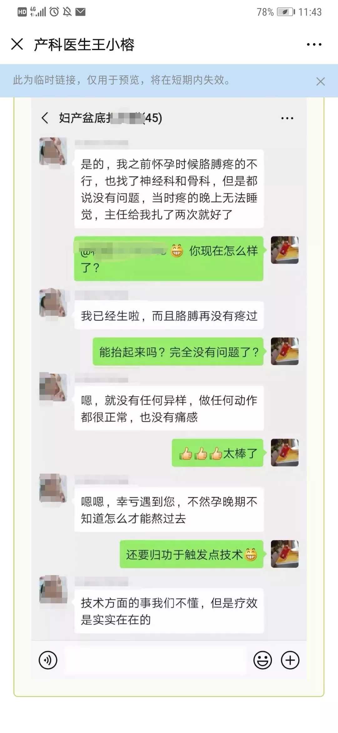 其实,只要掌握了原理和正确的治疗方法,疼痛无需忍受。在做产后疼痛治疗的这一年多,我们的效果越来越好,有产后腰疼不敢翻身一次就好的,有产后腿疼不敢动坐着轮椅来自己走出去的,有产后两个月蹲下起不来,要扶着墙才能慢慢站起,一次治疗痊愈的……当时产妇激动得泪流满面,紧紧抱住了我……每个病人都那么无助,治疗的过程都克服各种困难紧紧跟随,治疗痊愈后满心感激,给我留下了深刻的印象。这是一个孕期疼痛的病人——